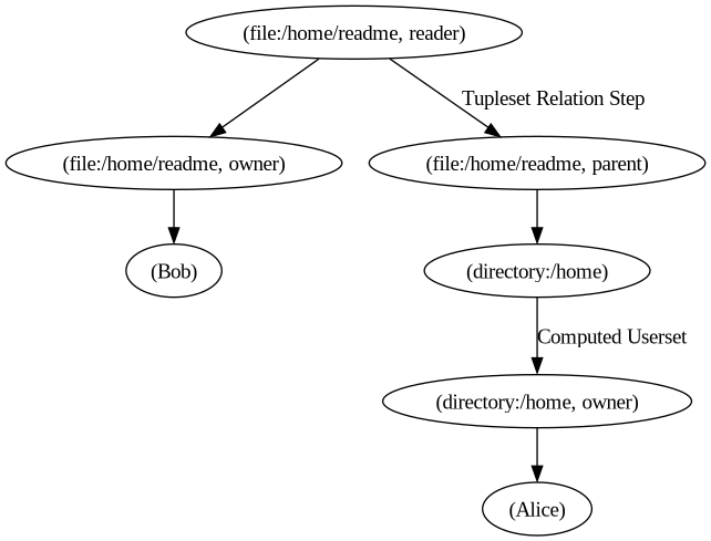In this example, having read permission on a directory should automatically grant read permission for all files within that directory. The Tuple to Userset rule enables this by defining relationships between objects dynamically.